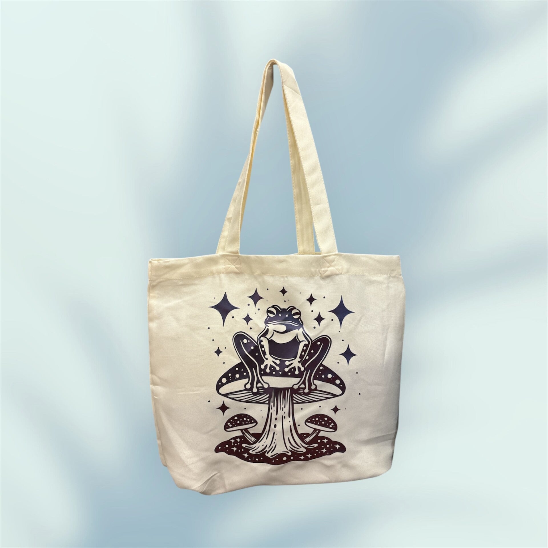 A whimsical cream tote featuring a celestial frog perched atop a magical mushroom, surrounded by stardust. Perfect for the dreamer, stargazer, or nature-loving spirit with a quirky twist.