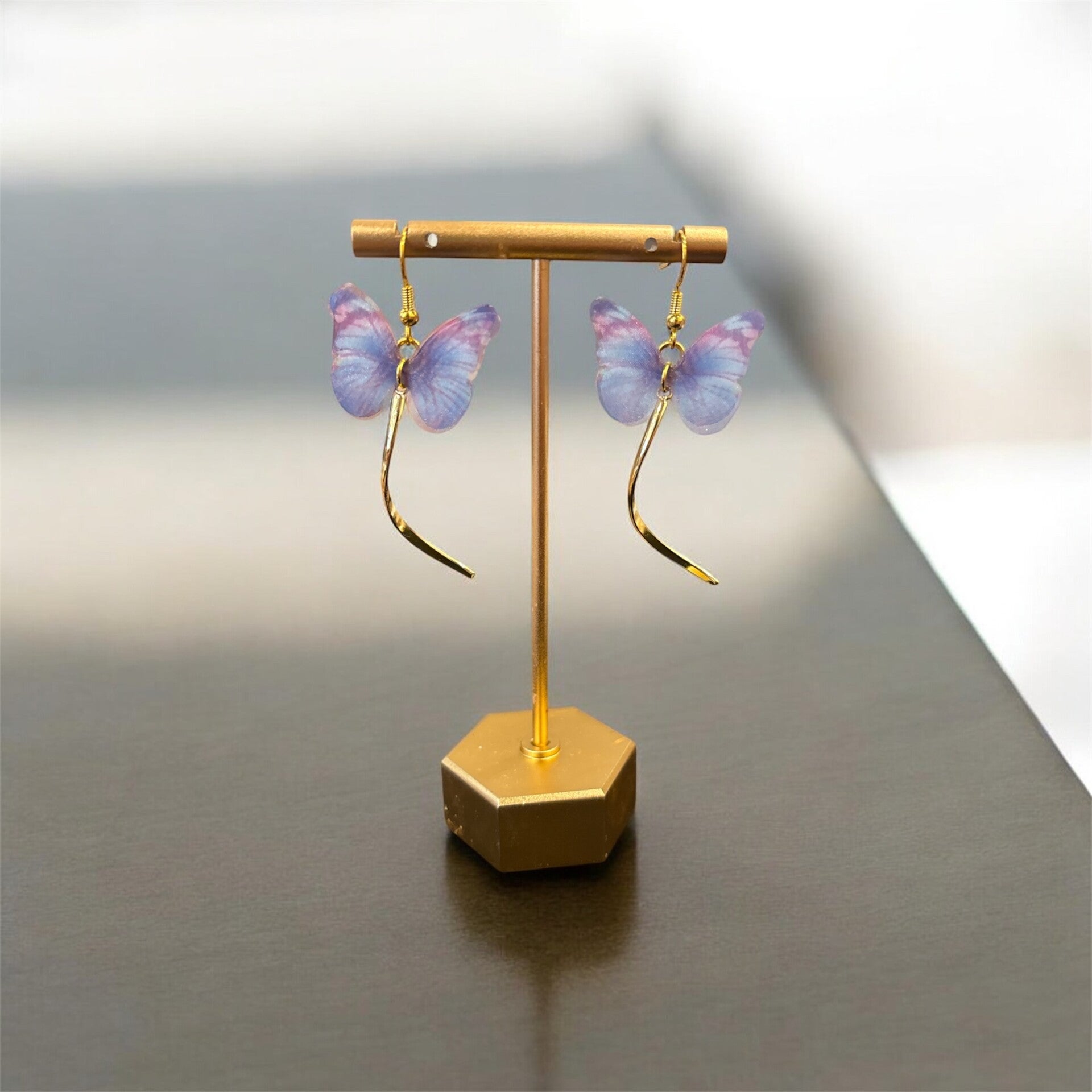 Soft violet and lilac butterfly wings paired with flowing, gold curved hooks for a graceful, windswept look.