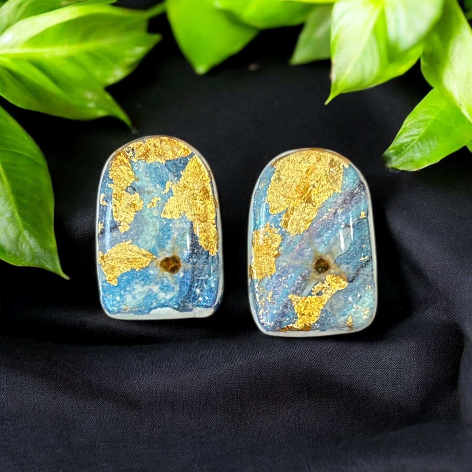 Sea-blue resin with shimmering waves of gold leaf, evoking tranquil tides and hidden riches.