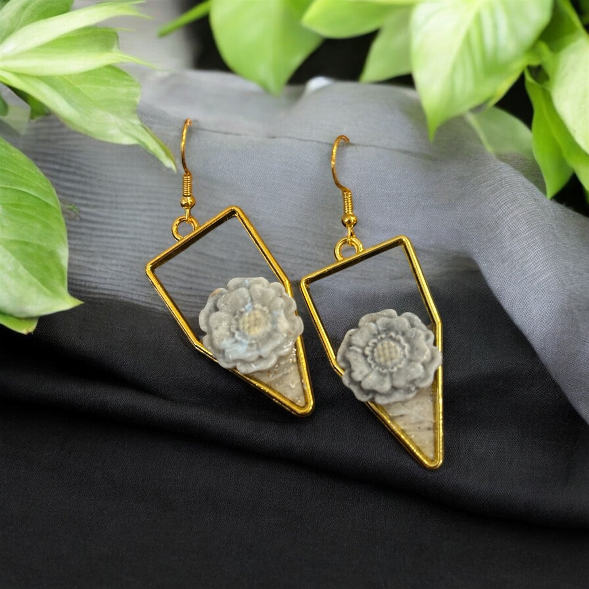 A chic fusion of modern lines and floral charm, these earrings feature open gold-tone geometric frames adorned with soft gray sculpted flowers for an elegant yet playful look.