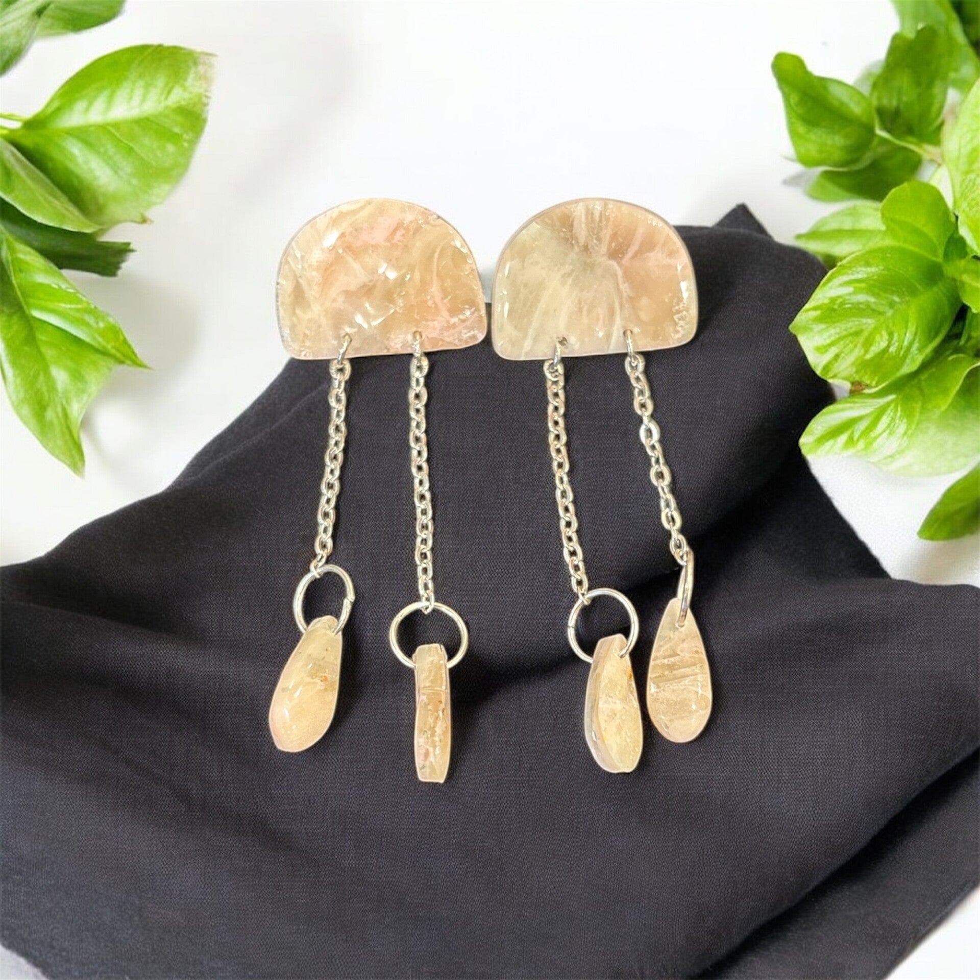 Featuring half-moon tops in a marbled amber hue and dangling teardrops suspended from silver chains, these statement earrings bring warm, earthy elegance with every movement.