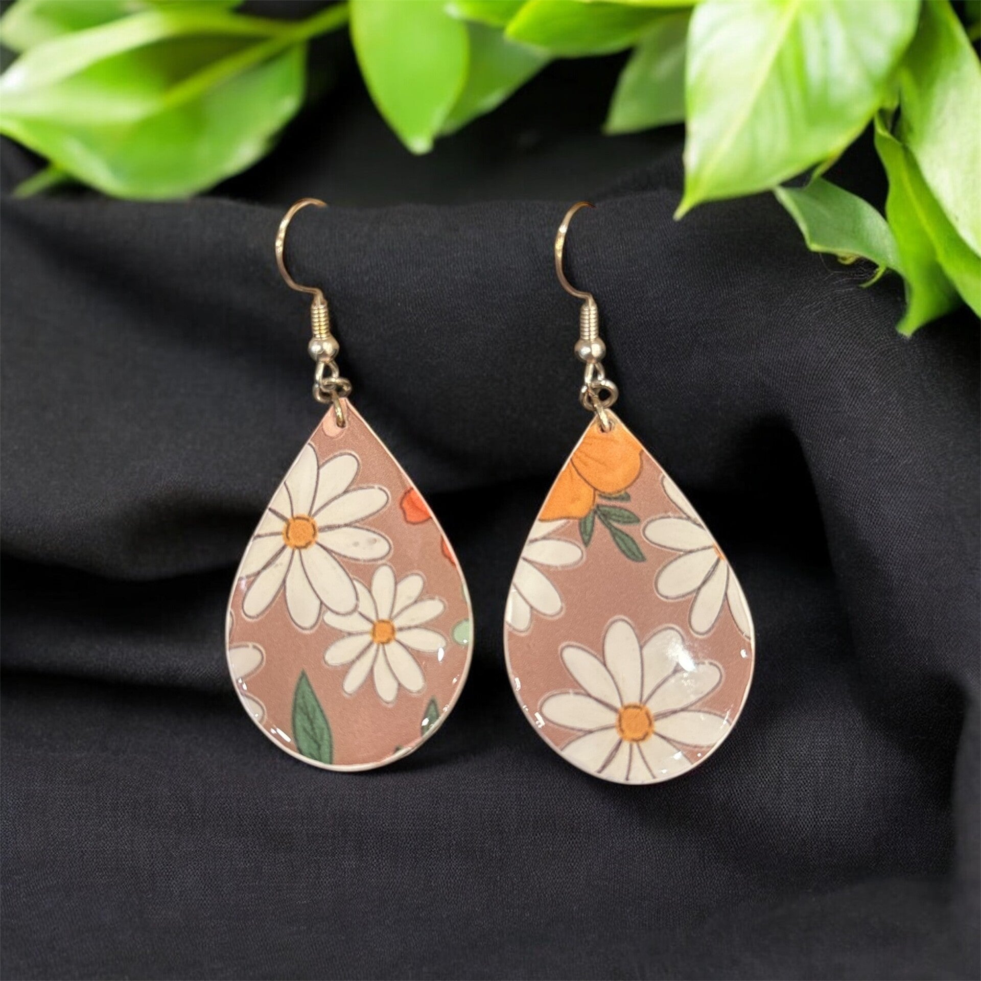 Sweet and cheerful teardrop earrings featuring white daisies on a warm taupe background, with a hint of golden yellow and orange blooms for a touch of sunshine.