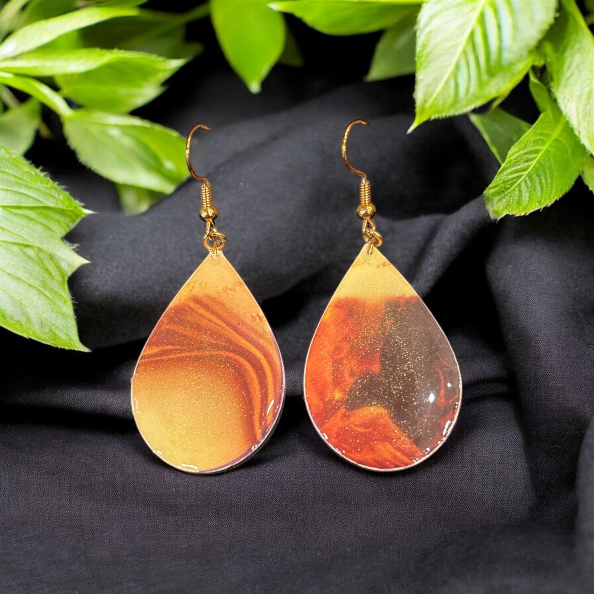 Glossy resin teardrops swirl with golden and amber hues, capturing the magic of a glowing desert sunset in every movement.