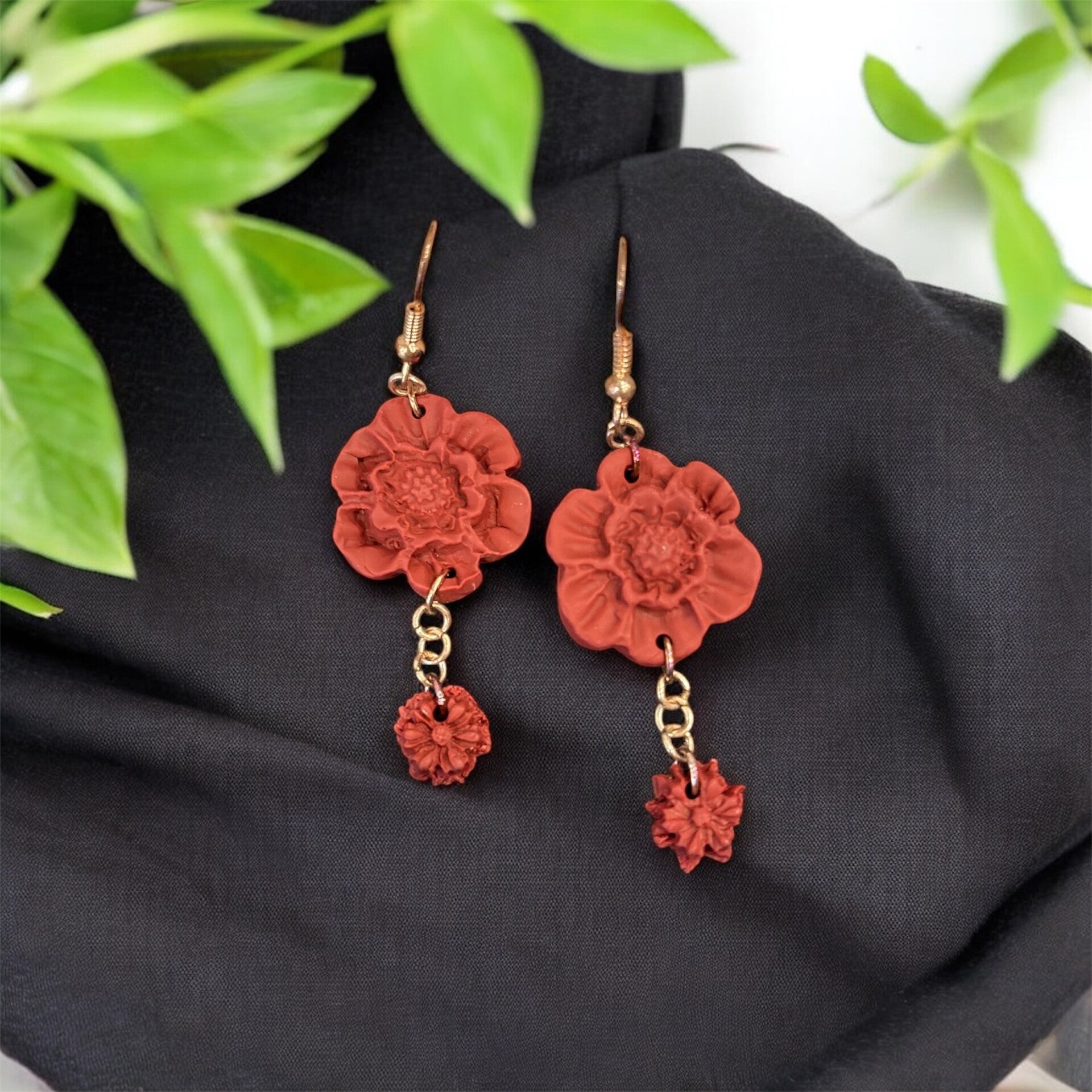 Rust-hued floral charms in a textured clay finish are linked with dainty chains, creating a warm, earthy, and romantic bohemian vibe.