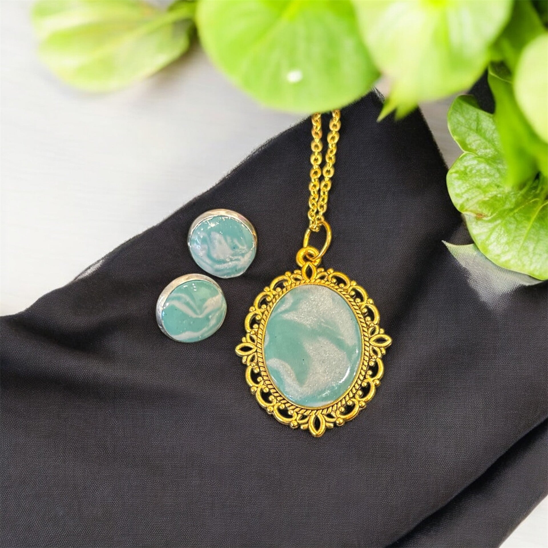 The golden cousin of the Ocean Mist set, this version pairs warm gold-tone metal with swirling seafoam resin for a rich, sunlit-sea vibe. Elegant enough for evening wear, yet breezy for daytime.